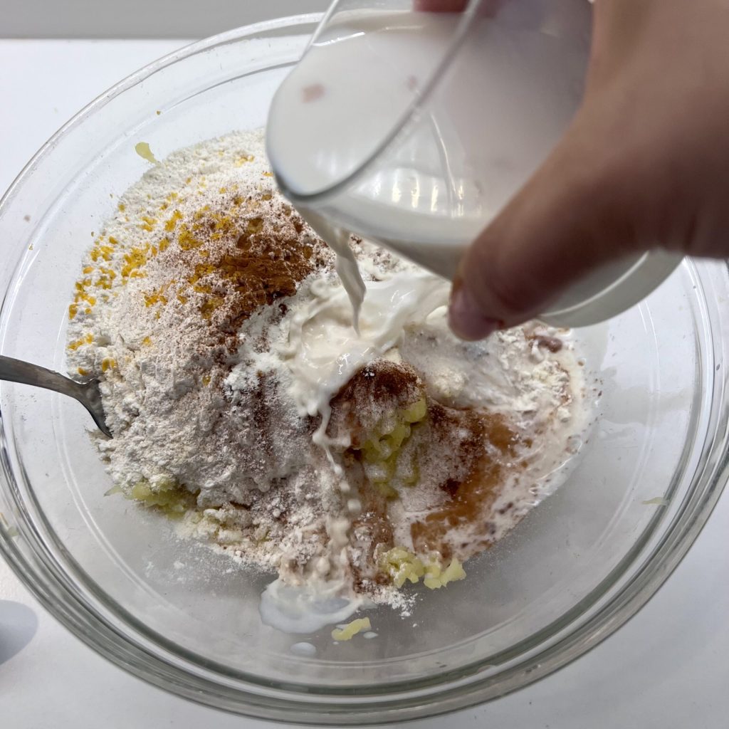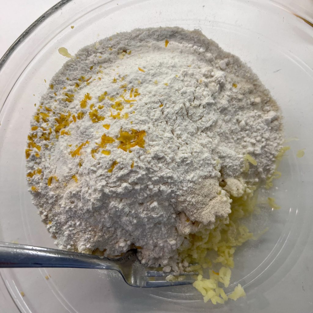 Agregad la leche a la masa y comenzad a mezclar. Como ya se anticipó, puede que se necesite más o menos leche, depende mucho de cuánta agua han absorbido las patatas hervidas. Mi consejo es añadirla poco a poco y evaluar la consistencia de la masa: si está muy seca, añadid poco a poco más leche. Si, en cambio, veis que la masa ya está suave y pegajosa, no pongáis toda la leche que prevé la receta.