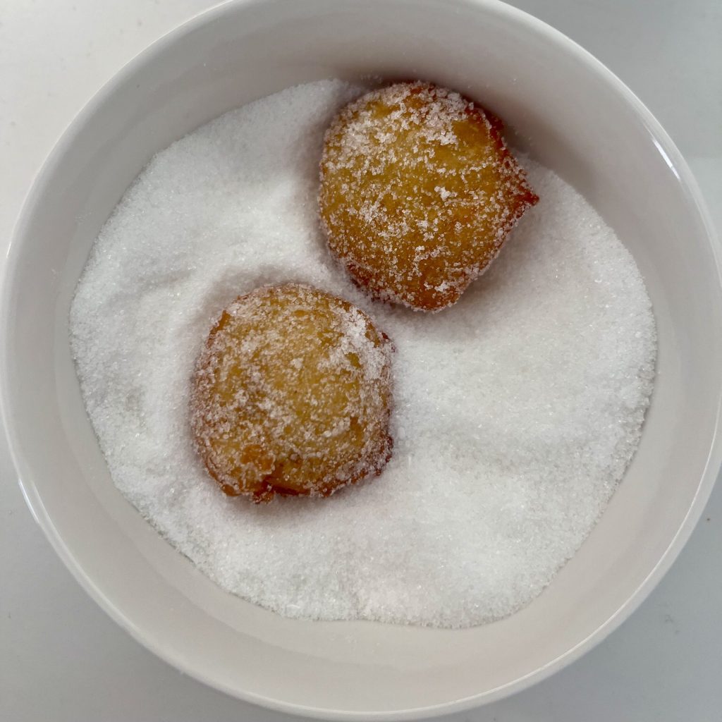 Llenad un bol con azúcar granulada y canela y pasad de inmediato las sfinci de San Martín por el azúcar, cuando todavía estén bien calientes. Yo no puse la canela también por fuera para mis niñas (pero la añadí en la masa), pero la receta original la prevé.