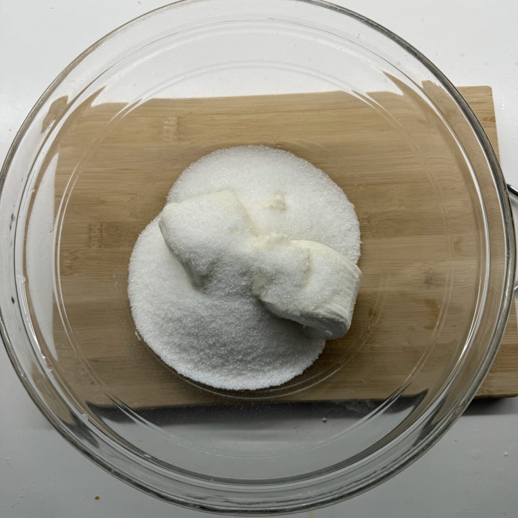 Pon en un bol el requesón y el azúcar. Yo utilicé requesón envasado sin lactosa, que de por sí es compacto, pero si utilizas el fresco, déjalo escurrir bien durante unas horas antes de usarlo.
