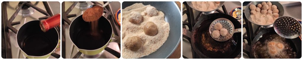 Mientras tanto, empanamos los buñuelos y los sumergimos en el aceite caliente, pocos a la vez porque estarán listos y crujientes en un instante.Yo no he añadido azúcar glas y los he servido calientes con la reducción de vino: una delicia.