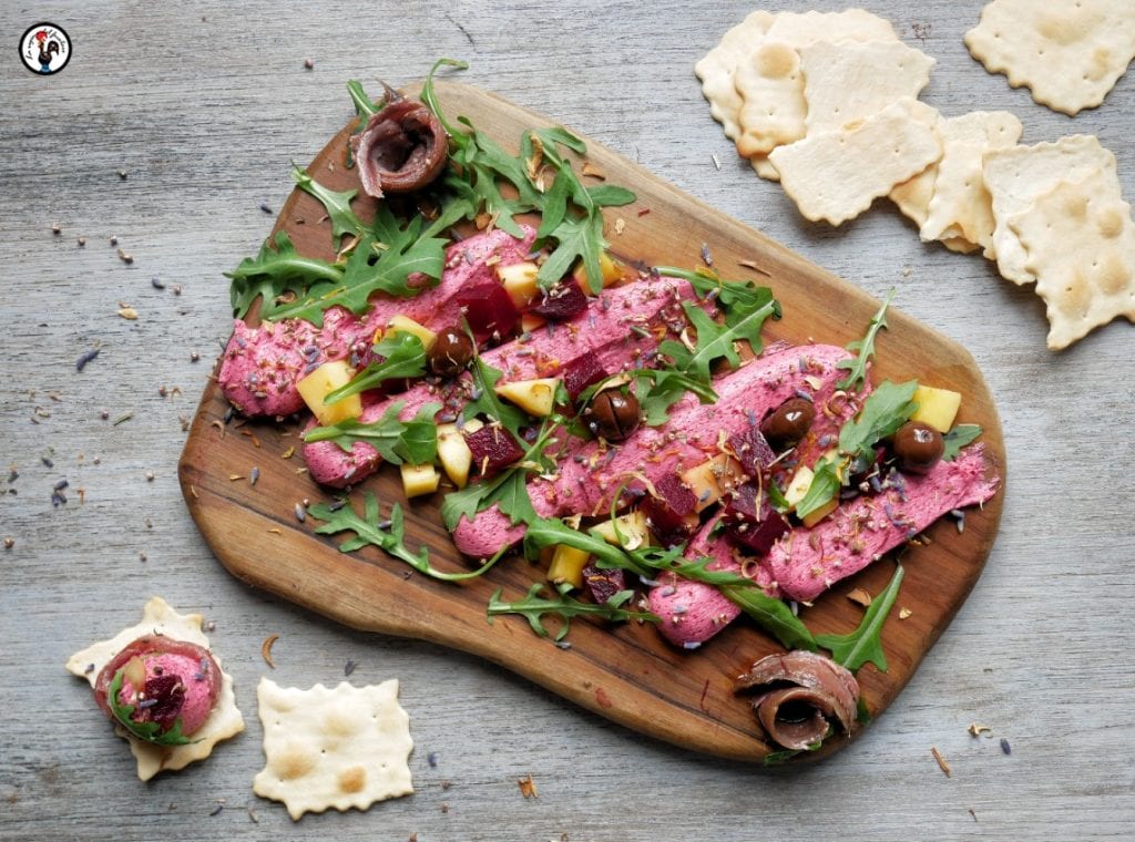 mi butter board está realmente a la última moda, de hecho he decidido amasar la mantequilla con una pequeña parte de remolacha triturada, así obtengo el color pantone 2023: magenta, pantone 18-1750! Uno de los colores más hermosos que ofrece la naturaleza, vibrante y romántico al mismo tiempo. Además, la mantequilla de remolacha se presta a muchas combinaciones de sabor y color, y este pequeño porcentaje de remolacha hace que la tabla de mantequilla sea más fresca y ligera.