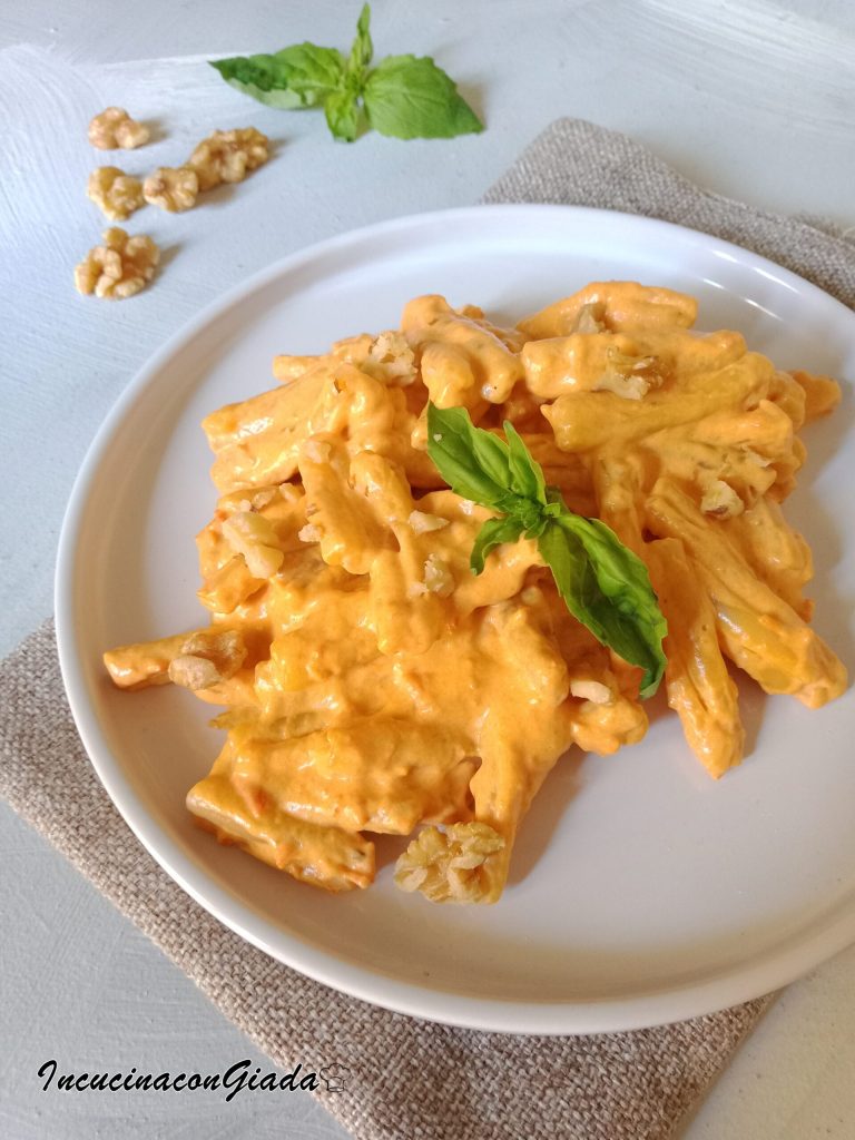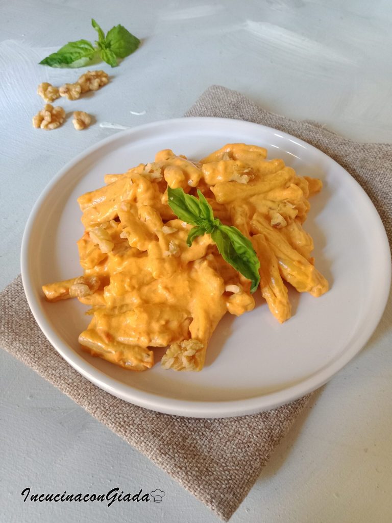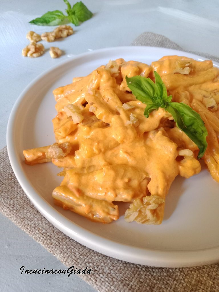 Caserecce a la crema de pimientos, un primer plato vegetariano realmente delicioso, se prepara fácilmente en muy poco tiempo.