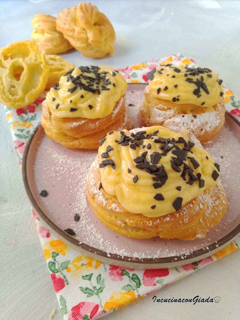 Son rosquillas suaves de pasta choux cocidas al horno o fritas, rellenas de crema pastelera y decoradas con guindas en almíbar y una espolvoreada de azúcar glas. En mi caso, dado que las guindas no gustan mucho, las decoré con crema y virutas de chocolate negro 😋.