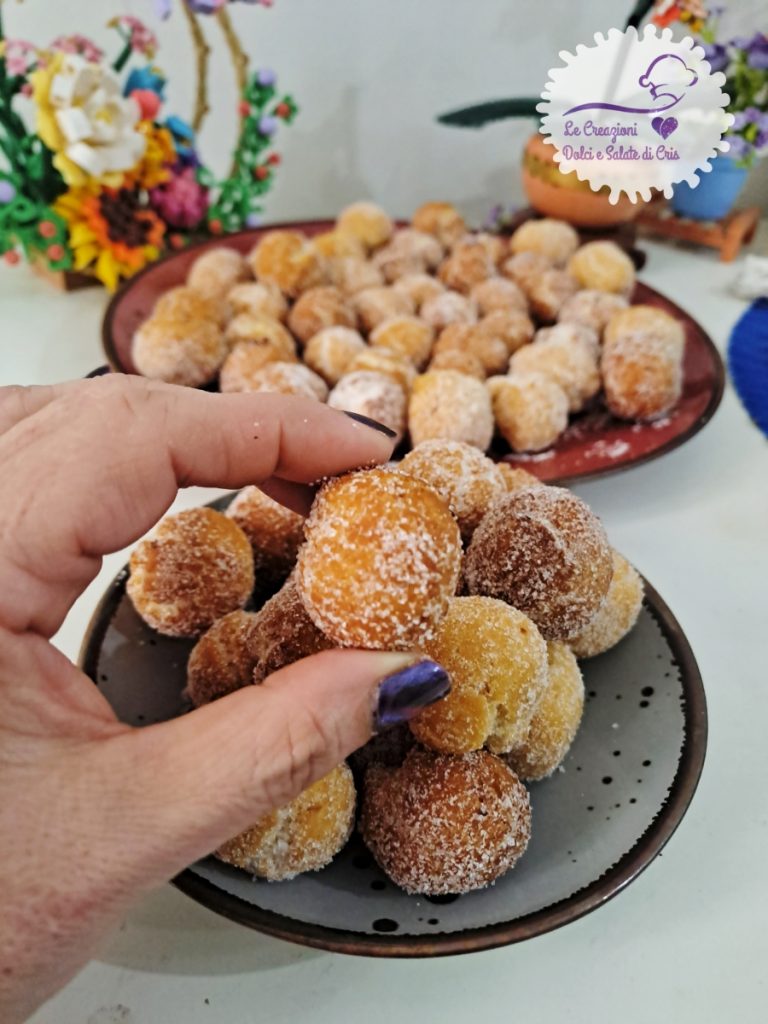 A medida que freímos las castagnole, las colocamos en papel absorbente para eliminar el exceso de aceite y, cuando aún están calientes, las pasamos por el azúcar granulada.