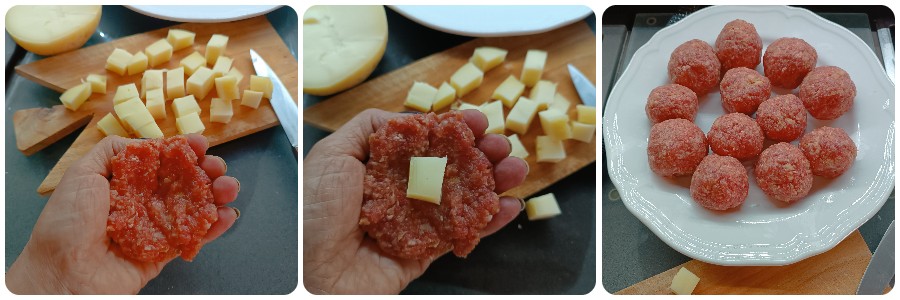 Toma un poco de masa de albóndigas del bol y aplástala en la palma de la mano. Rellena el centro con un cuadrado de provola. Ciérrala y forma la albóndiga. Haz las otras albóndigas y colócalas en un plato.