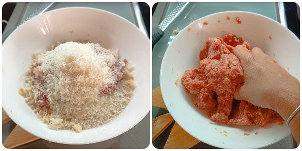 Introduce la carne picada en otro bol, añade la carne picada, añade el queso parmesano rallado, el huevo, la sal y la miga de pan bien escurrida. Mezcla la masa y amalgama todos los ingredientes. Si la masa no queda lo suficientemente firme, añade un poco de pan rallado.