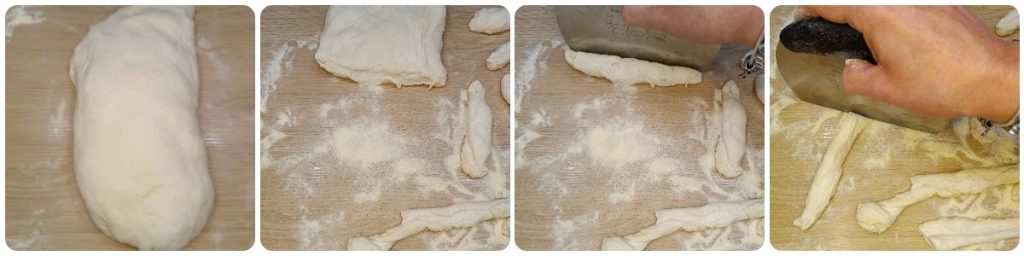 Espolvorea la superficie de trabajo con sémola remolinada. Extiende la masa con las manos procurando no aplanarla demasiado (servirá para obtener angelitos aún más suaves y esponjosos), y con un cortapastas o una rueda cortapizza obtén tiras no más largas de 7-8 cm. En caso de que resulten demasiado largas córtalas por la mitad.