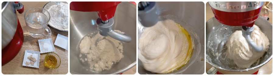 Unid a la harina la levadura fresca desmenuzada y mezclad para integrar los ingredientes. Añadid el agua poco a poco y mezclad. Luego la sal y finalmente el aceite de oliva virgen extra. Amasad hasta obtener una bola lisa; hacer algunos pliegues le dará mayor elasticidad y esponjosidad a la masa.