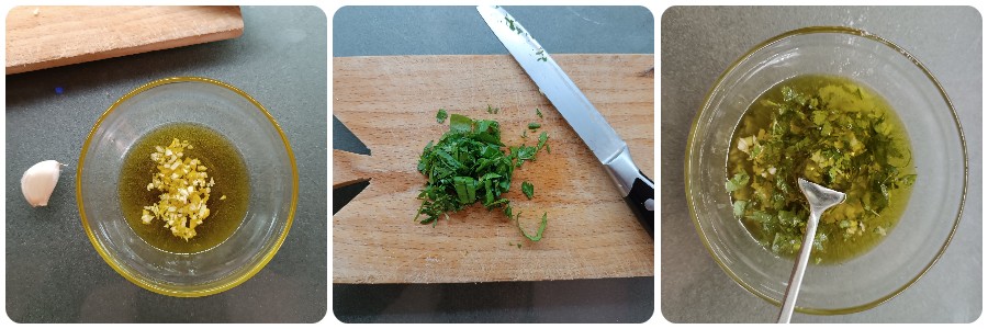 En un bol, mezcla y bate con un tenedor el aceite de oliva virgen extra con el ajo picado o en rodajas, el perejil y la albahaca picada, el vinagre, una pizca de sal, y si te gusta, un poco de guindilla o pimienta.