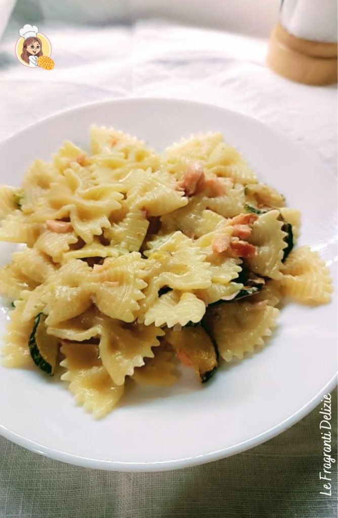 Farfalle con calabacines y salmón ahumado y queso crema, cremosas y muy rápidas de preparar y al menos un par de veces a la semana las pongo en la mesa. Ah sí, porque para quienes, como yo, trabajan todo el día, el tiempo para cocinar se reduce a la pausa del almuerzo o a la noche. Así que los platos simples, rápidos y sabrosos, esos «sciuè sciuè» como los Spaghetti con atún, tomatitos y robiola son una verdadera salvación.