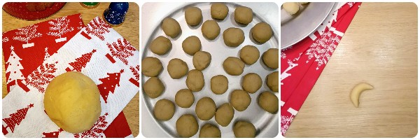 Coloca los vanillekipferl en una bandeja forrada con papel de horno, separándolos entre sí.