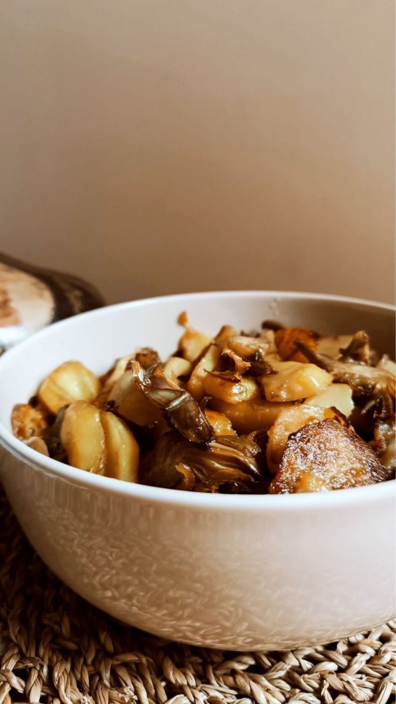 Patatas y alcachofas en sartén, una guarnición de temporada sencilla que preparo a menudo y que aprendí a hacerla de mi madre. Un plato simple, sabroso y genuino, típico de la cocina mediterránea. Perfecto para acompañar segundos de carne como las albóndigas o platos a base de pescado como el filete de dorada, pero también para complacer a vegetarianos y veganos. Patatas crujientes en la superficie con un corazón tierno que se encuentran con rodajas de alcachofas tiernas y sabrosas.