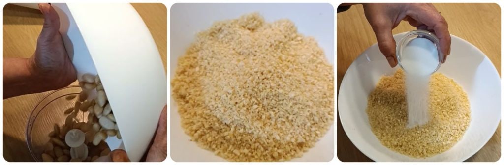 Primero comienza triturando las almendras y las avellanas: tritura finamente las almendras y de forma más gruesa las avellanas tostadas. Puedes hacerlo manualmente con un cuchillo o usar un triturador como yo hice. Vierte las almendras trituradas en un bol y luego añade el azúcar.