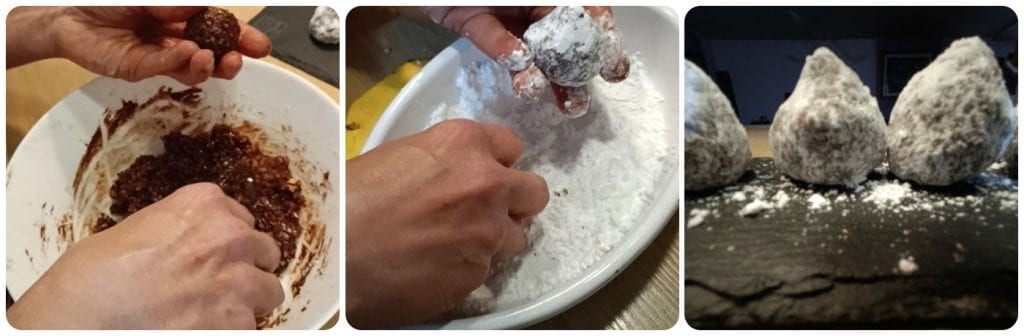 Cierra la masa y dale una forma esférica. Coloca la trufa de chocolate con corazón de avellana en un plato o recipiente y cúbrelo con azúcar glas. Repite la operación hasta que se acabe toda la masa.