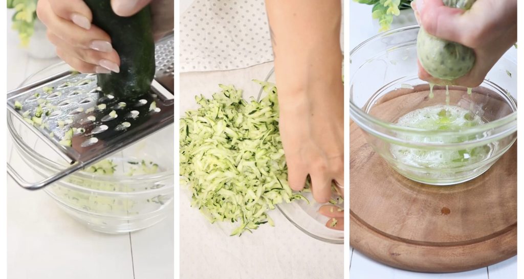 Eliminamos los extremos del calabacín y lo rallamos utilizando los agujeros grandes. Ponemos el calabacín rallado en un paño de algodón y lo exprimimos bien, para sacar toda el agua sobrante.