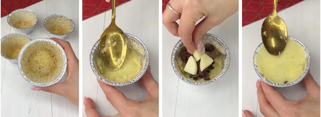 Tomamos unos moldes o flaneras; yo usé las de aluminio de aproximadamente 5 cm. Vertemos un chorrito de aceite sobre toda la superficie interna y hacemos adherir el pan rallado, de este modo las tortitas no se pegarán. Procedemos colocando en el fondo de cada flanera una cucharada de patatas; en el centro añadimos las setas y algunos cubos de queso, luego cerramos con otra cucharada de patatas, nivelando bien la superficie.