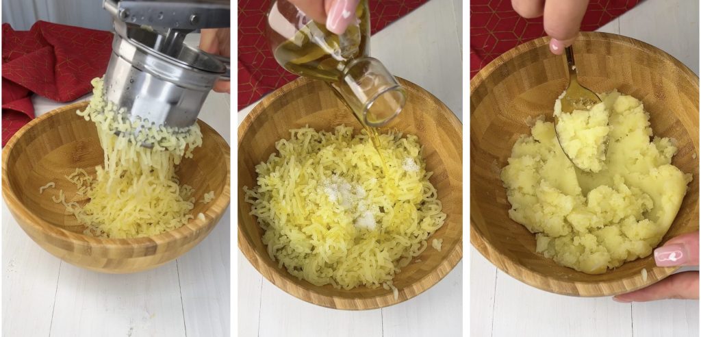 Mientras tanto, preparamos las setas. En una sartén calentamos un chorrito de aceite con un diente de ajo. Añadimos las setas lavadas y cortadas en rodajas, añadimos el perejil picado finamente y una pizca de sal. Dejamos cocer durante unos 10 minutos. Mientras tanto, cortamos el queso en cubos.Aplastamos una parte de las patatas y las transferimos a un bol. Añadimos una pizca de sal y un chorrito de aceite de oliva virgen extra, luego mezclamos bien obteniendo una mezcla homogénea. No será necesario añadir huevos u otros ingredientes.