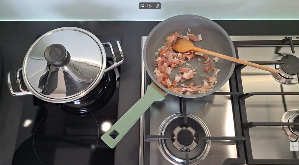 Luego añade el speck cortado en tiras con las tijeras: así es más cómodo y rápido de manejar. Déjalo dorar lentamente, removiendo de vez en cuando. Cuando esté listo, apaga el fuego y resérvalo, será la base de tu crema.