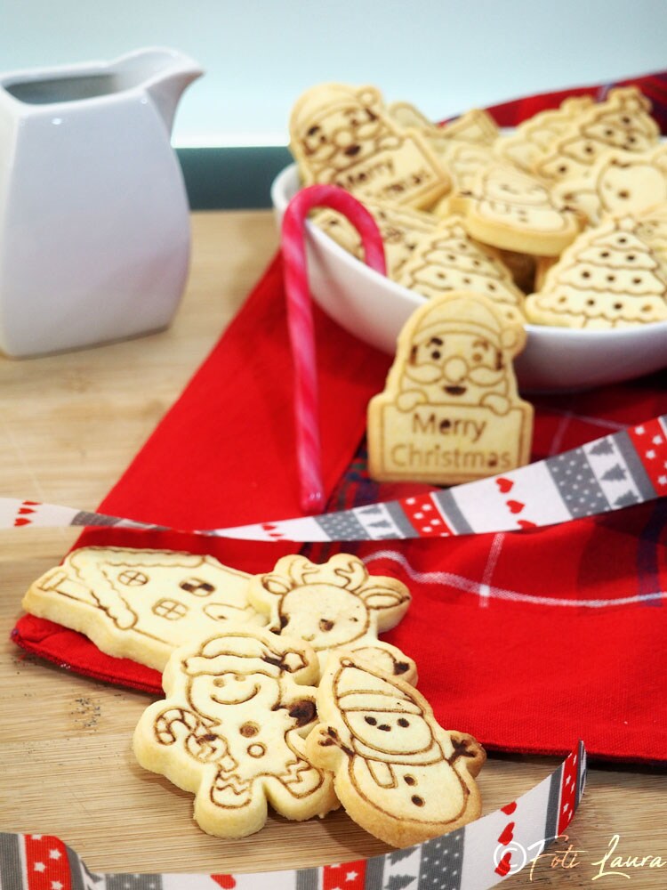 Con un cortador de galletas, corta las formas (utiliza los cortadores que compré haciendo clic aquí –> Cortador de galletas *Enlace afiliado) y colócalas en una bandeja forrada con papel de horno. Usa el molde sumergiéndolo en cacao en polvo y presionándolo sobre la galleta para aplicar el diseño.