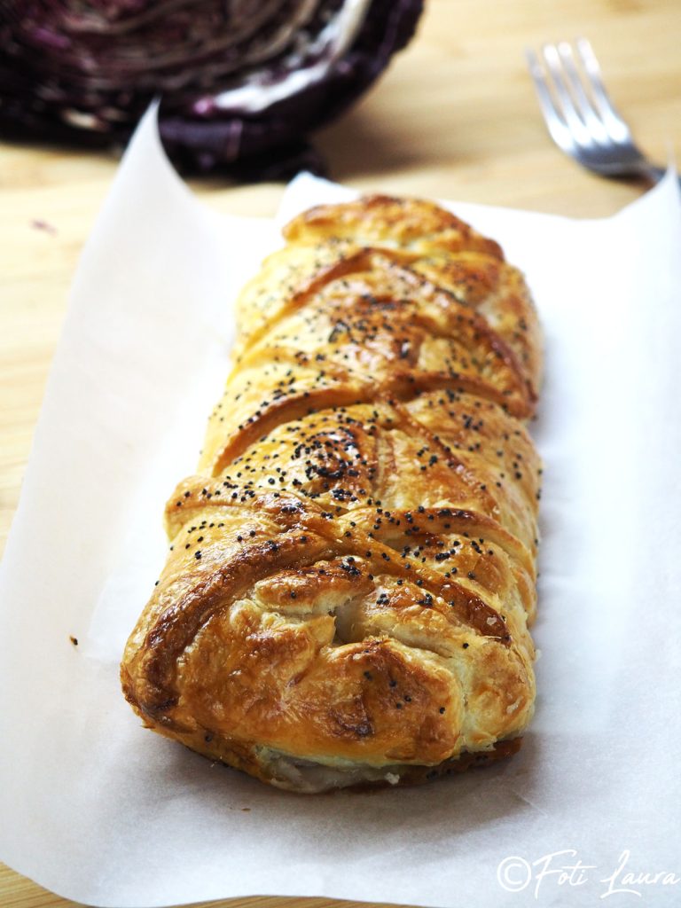 Coloca encima las lonchas de salmón ahumado, luego las rodajas finísimas de manzana y finalmente distribuye la achicoria estofada.Cierra cada rollo sobre sí mismo sellando bien los bordes. Usa las tiras de masa sobrantes para crear decoraciones en la superficie. Pincela con el huevo batido.