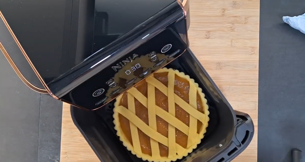 La he cocido en una freidora de aire usando un molde de 20 cm, obteniendo así una masa quebrada crujiente y un fondo bien seco, sin encender el horno grande.