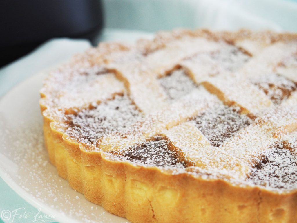 Con la masa sobrante forma las clásicas tiras y colócalas sobre la tarta.