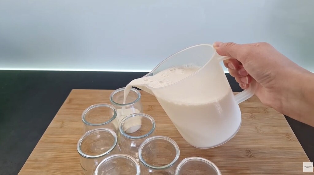 El yogur parecerá muy suave, pero es normal. Cierra inmediatamente los tarros con las tapas y ponlos en el frigorífico por al menos 6-8 horas (toda la noche es lo ideal).