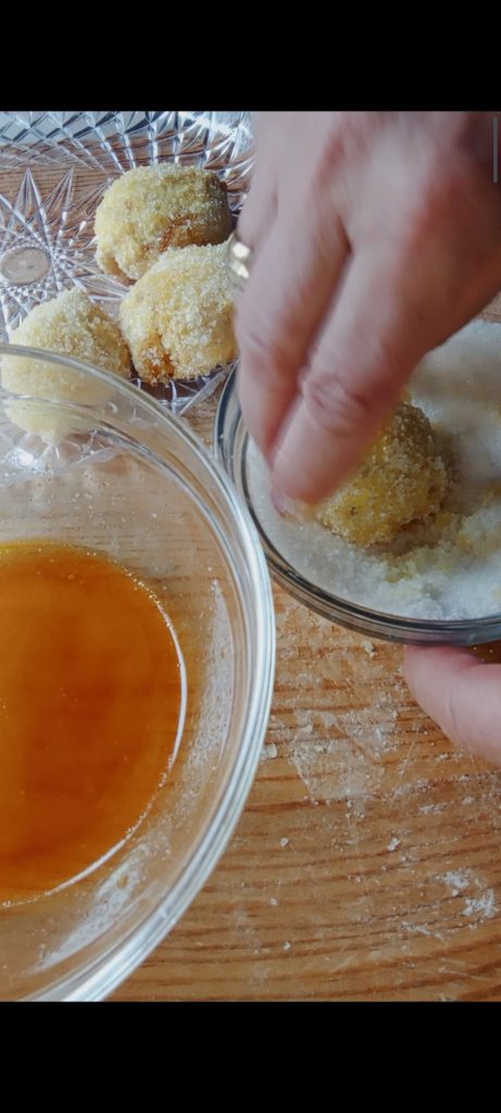• Preparar un baño con el agua o el limoncello, el zumo de limón y el azafrán. Mojar ligeramente los limoncitos después de haberlos sacado del horno y dejado enfriar un poco. Pasarlos uno por uno en el azúcar.