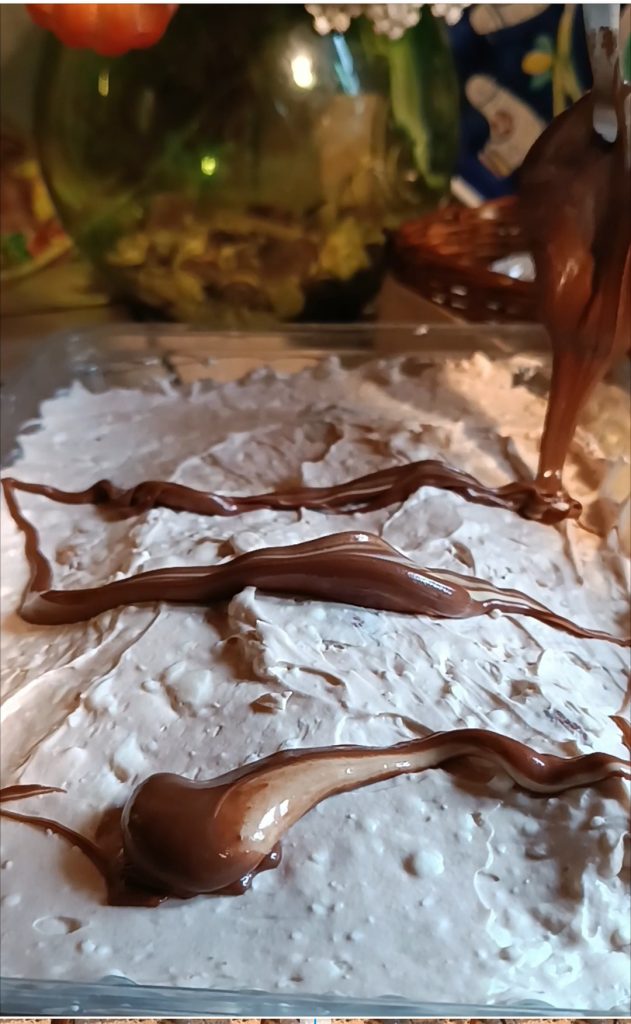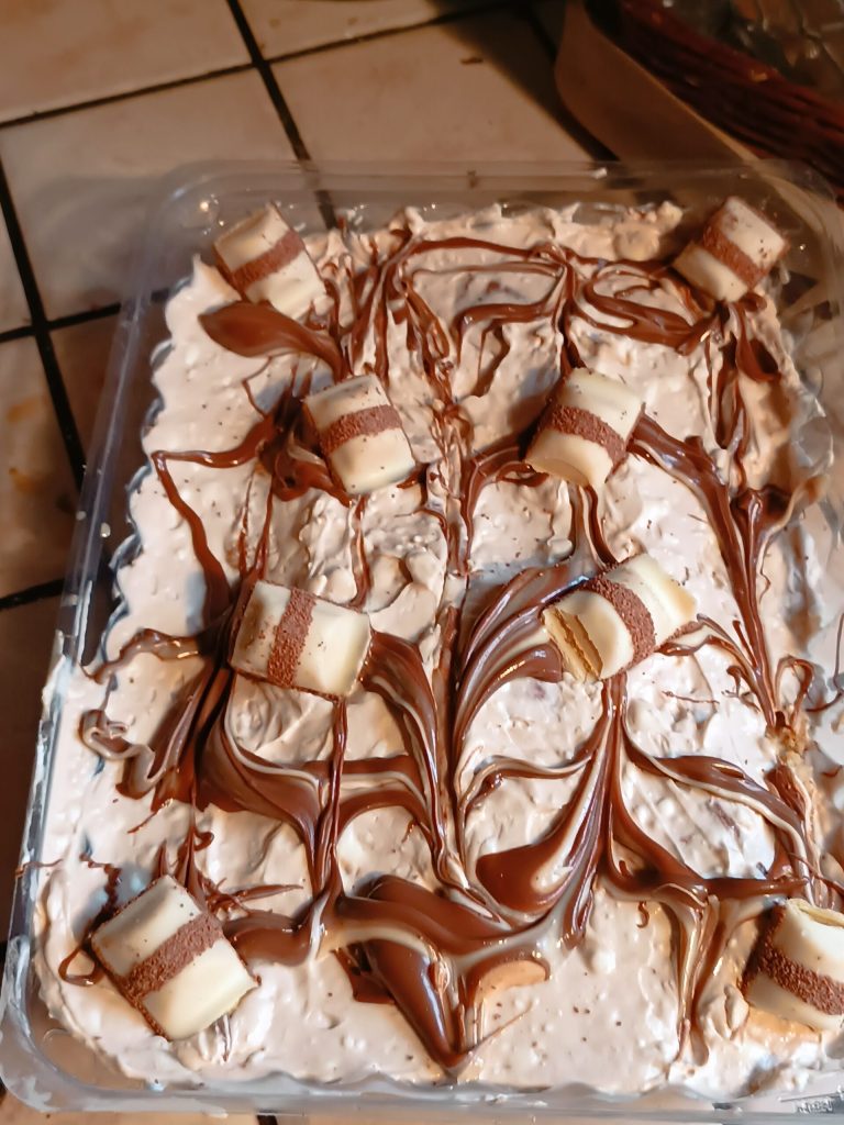 Cubre con la crema de mascarpone. Continúa con una segunda capa de bizcochos de soletilla empapados y cubre con la crema de mascarpone restante. Decora con una capa de Nutella y con el otro paquete de Kinder Bueno.