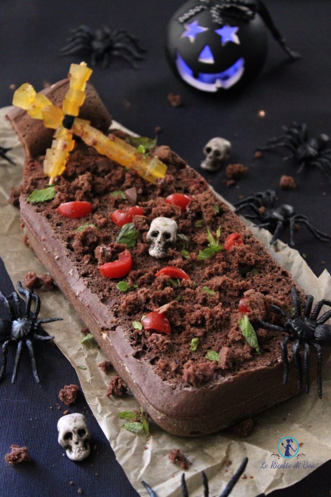 Desmenuzamos con las manos la parte alta del plumcake que hemos cortado para crear el efecto de tierra sobre el ataúd y nuestro dulce para Halloween está listo!