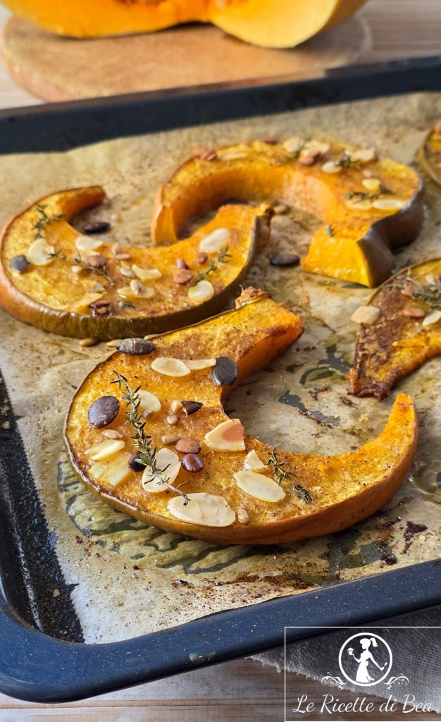 Consejos: como ya está escrito, les recomiendo dejar la piel en las rodajas de calabaza, así permanecen bonitas y compactas durante la cocción. Controlen la cocción después de los primeros 30 minutos, para que no se quemen y queden perfectas para cortar y emplatar para ser servidas en la mesa.