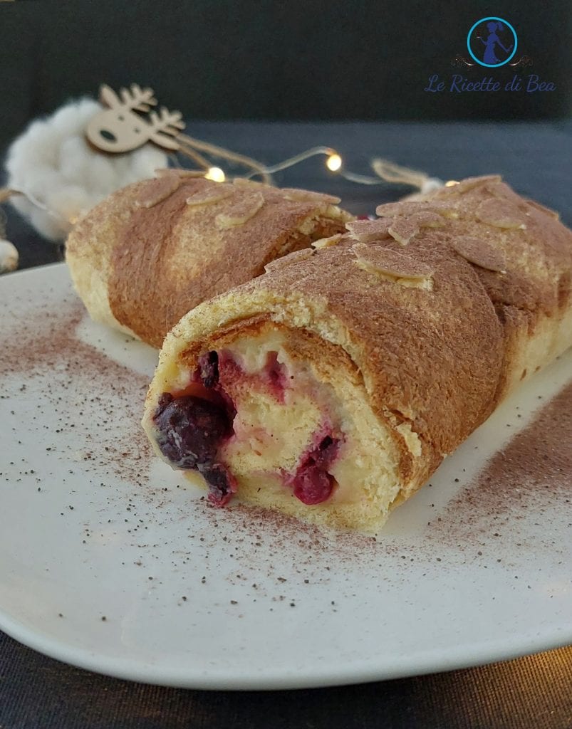 ¿Podía entonces no preparar otro postre con pandoro para esta Navidad?!? Así que aquí estoy para presentaros el Rollo de Pandoro con crema pastelera hecha en casa y salsa de frutos rojos, he añadido también algunas láminas de almendras y cacao. No quería usar el glaseado de chocolate, no soy muy buena con decoraciones y adornos, las pobres Galletas de Canela que tanto os están gustando son los verdaderos testigos de esto. Así que opté por el más sencillo pero siempre perfecto cacao en polvo para dar el efecto de Tronco de Navidad a mi rollo con pandoro.