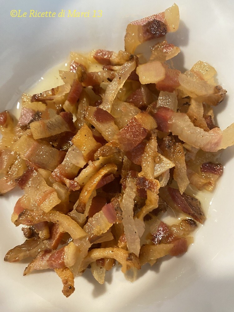 1) rigurosamente guanciale curado (NO panceta) cortado en tiras (NO cubos). La diferencia entre guanciale y panceta es fundamental: el guanciale es mucho más graso que la panceta pero también más aromático y sabroso, al cocinarse, la grasa se derrite, da sabor a la amatriciana, y no se vuelve seca como la panceta;