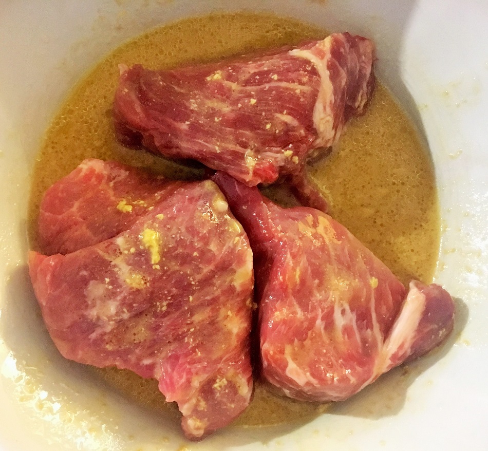 Estofado de cerdo con miel y mostaza, con zumo de naranja