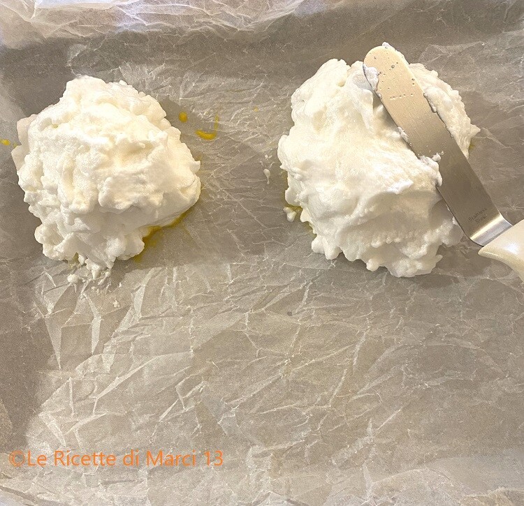 Colocad sobre los círculos de yema, las claras montadas colocándolas como una nube (deben ser altas, como en la foto). Y redondeadlas con una espátula.
