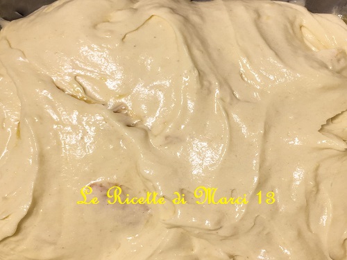 Coged un bol y batid bien la mantequilla suave con el azúcar con la batidora eléctrica, luego añadid los dos huevos enteros (¡uno a la vez!) la harina tamizada con la levadura en polvo, la mermelada y la leche, hasta obtener una masa bien montada y cremosa (como en la foto de arriba).