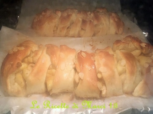 Distribuye el relleno de manzana sobre los 2 rectángulos de masa, colocándolo en el centro y dejando los bordes libres. Haz cortes en los bordes laterales para formar tiras, luego toma las tiras de masa y ciérralas hacia el centro superponiéndolas y encerrando el relleno, tratando de crear una trenza. Yo obtuve dos