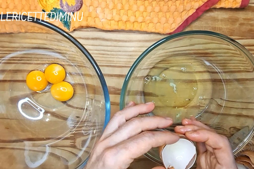 • Utilizando dos cuencos, separar las yemas de las claras y montar estas últimas a punto de nieve con las batidoras eléctricas.