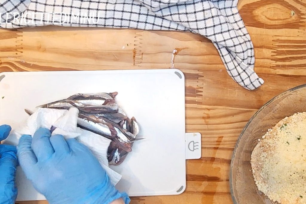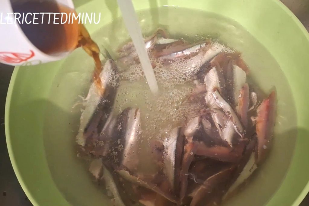 Para preparar los boquerones empanados al horno, empieza lavando los boquerones bajo el agua corriente. En el agua del último enjuague, añade media taza de vinagre de vino tinto.