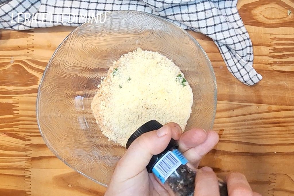 Para preparar los boquerones empanados al horno, comienza sazonando el pan rallado con queso parmesano o pecorino rallado, perejil y ajo finamente picados y pimienta negra recién molida.