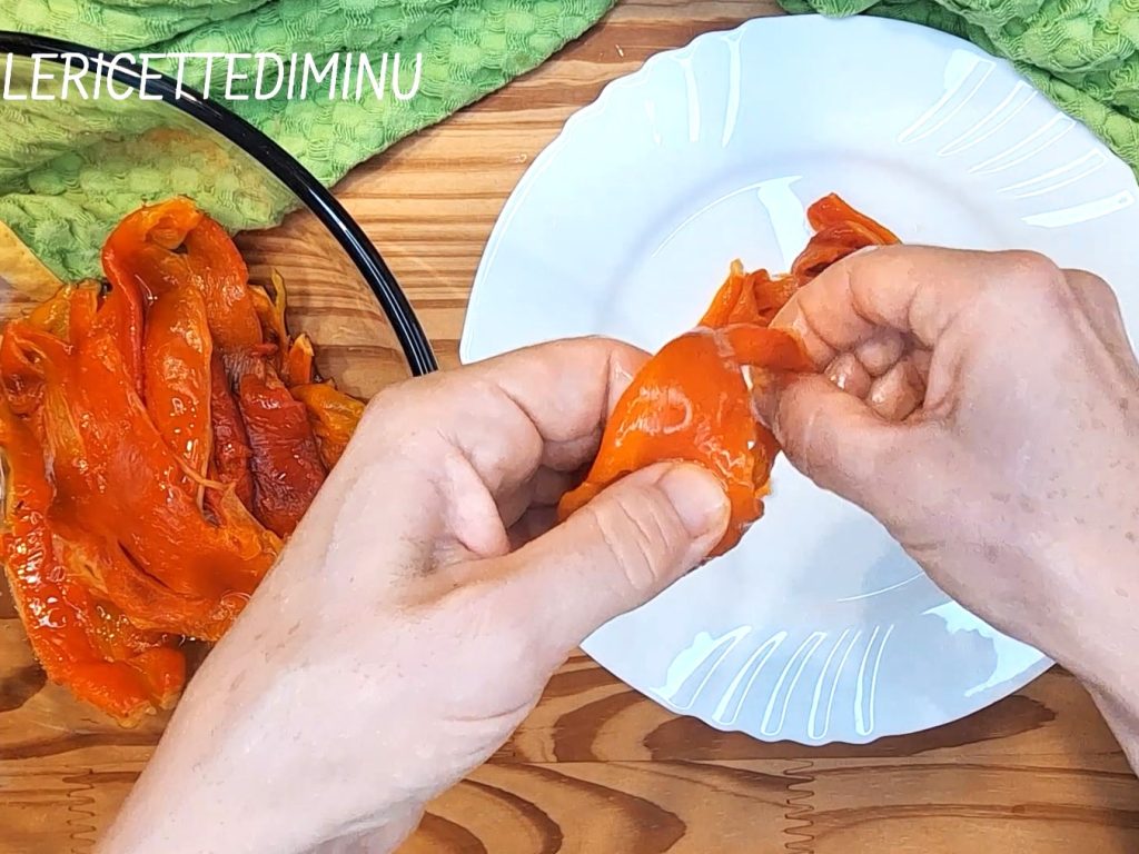• Proceder a pelarlos después de que se hayan enfriado un poco, eliminando al mismo tiempo el pedúnculo y todas las semillas.