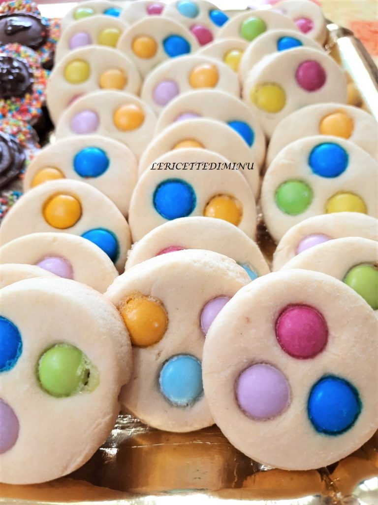 • En la superficie de las galletas colocar 3 confites de diferentes colores, presionando para que entren en parte en la masa. Hornear durante unos 12 minutos.