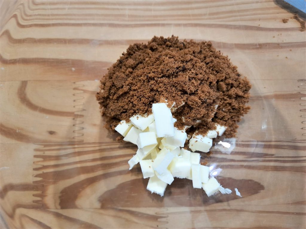 Cuando la mantequilla tenga una consistencia de pomada, trabajarla por poco tiempo con el azúcar de caña integral.