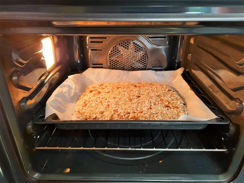 Distribuir la mezcla en la bandeja de horno forrada con papel de horno y compactar. Hornear en horno estático, nivel medio/bajo, a 170 grados, durante unos 20 minutos.