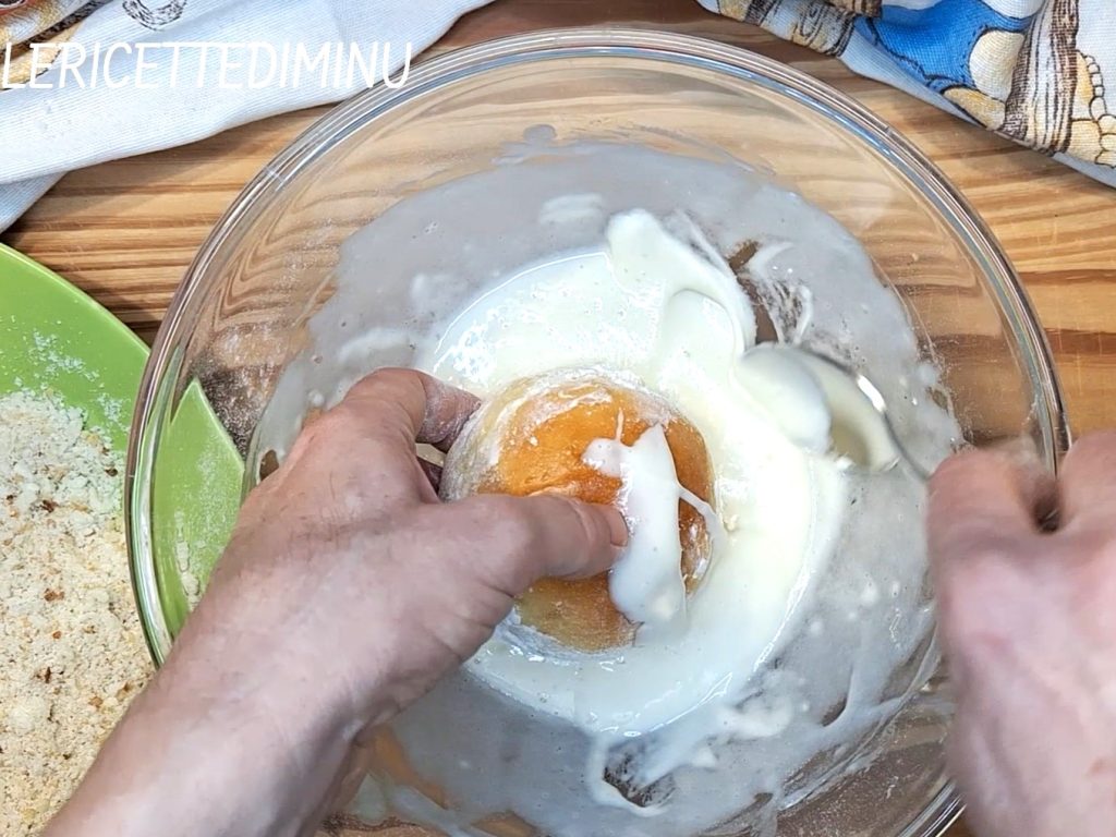 Luego sumergirlos en la mezcla y finalmente pasarlos en el bol que contiene pan rallado y miga.