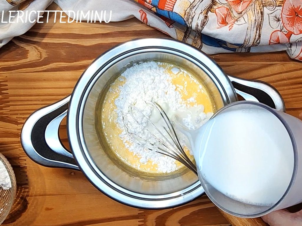 Luego, añadir gradualmente los 50 gramos de almidón e incorporarlos a la mezcla añadiendo poco a poco los 600 ml de leche.