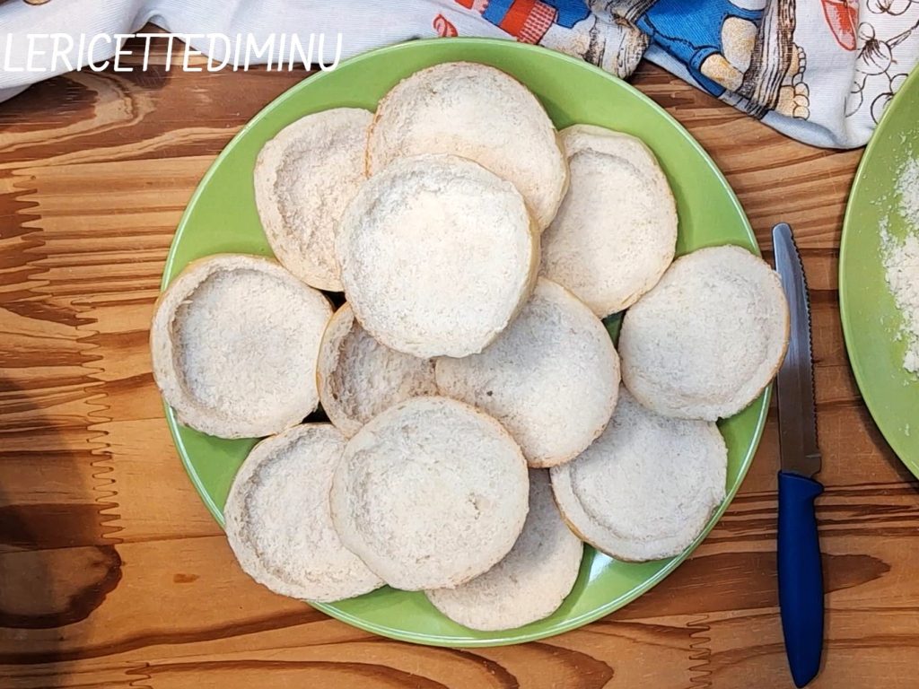 Como primera cosa, preferiblemente con un cuchillo para pan, cortar por la mitad los panecillos de leche (para la receta haz clic aquí) y quitar la miga tanto de la parte superior como de la inferior.