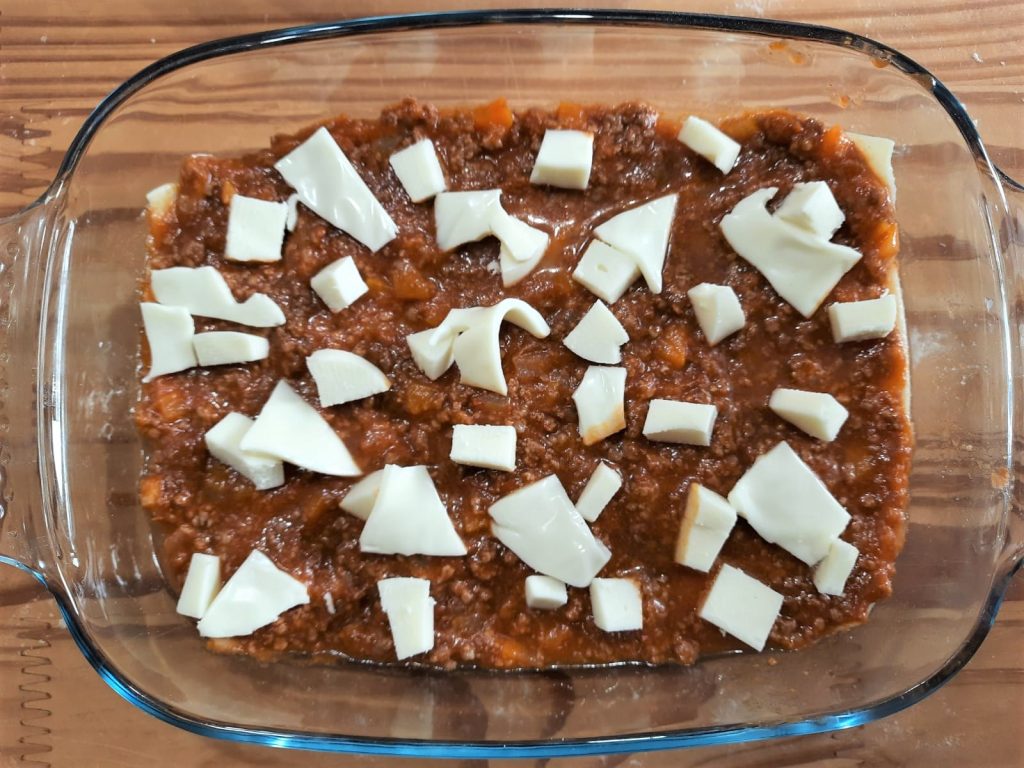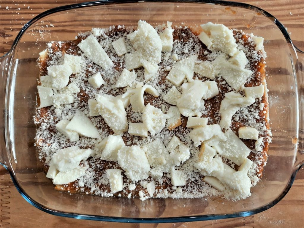 Cerrar la capa final con ragú, copos de bechamel, parmigiano rallado y trocitos de mantequilla.