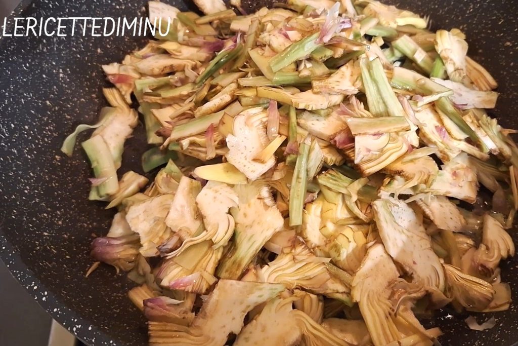 En una sartén, dorar un diente de ajo grande. Luego agregar las rodajas de alcachofa escurridas.