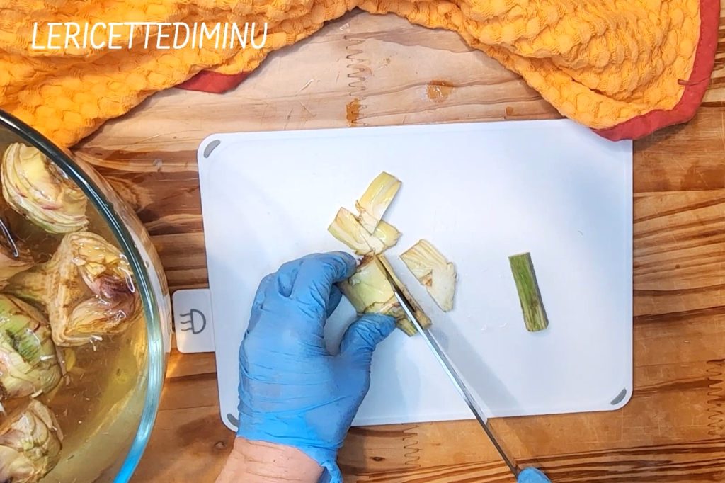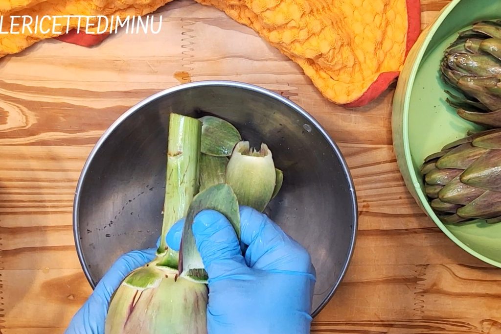 Cortar la parte superior de las hojas y abrir la base por la mitad, eliminar la pelusa. Colocar en el agua con el zumo de limón.